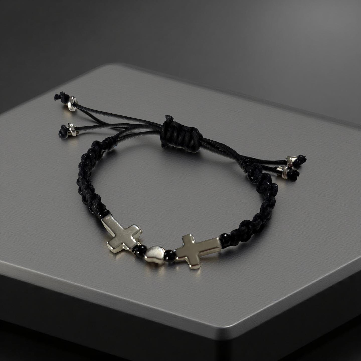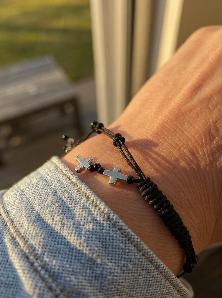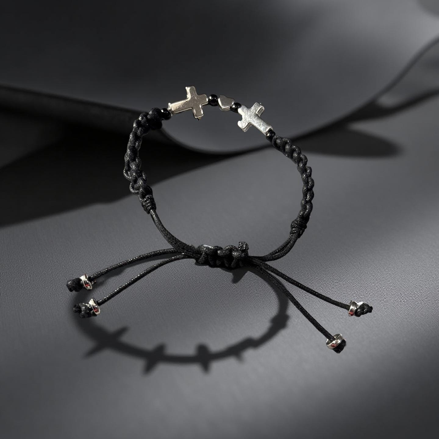 Handmade Breaded bracelet adjustable with two silver cross and black beads. It is made with strong Chinese waxed cord. Simple and elegant.